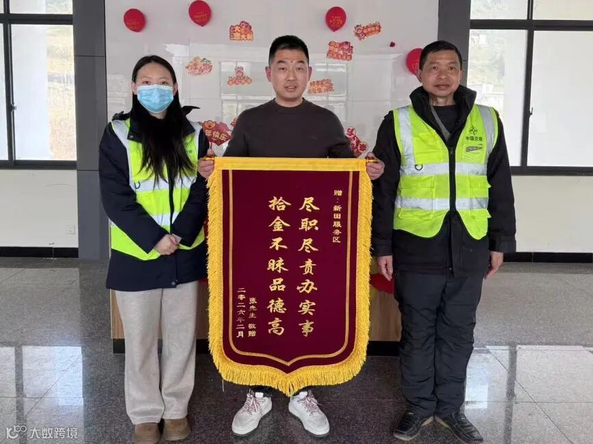 2月21日,贵州的张先生专程来到忠万高速新田服务区,将一面印着“尽职尽责办实事,拾金不昧品德高”的锦旗送到工作人员手中,以最朴实的方式,表达自己满心的感激之情。