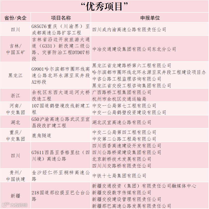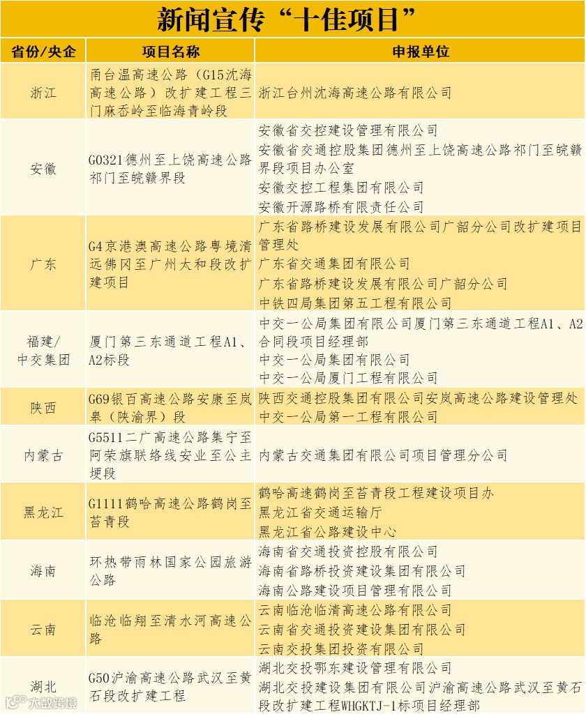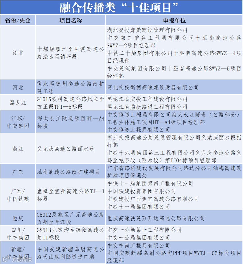 日前,由中国交通报社与交通运输部公路科学研究院、中国交通报刊协会联合主办的2025年公路重大工程新闻宣传“优秀项目”征集展示活动完成终审,来自交通运输部有关司局、科研院所、社会团体等单位的专家组成评审委员会,选出公路重大工程新闻宣传“十佳项目”10个、主题策划类“十佳项目”10个、融合传播类“十佳项目”10个、创意创新类“十佳项目”10个,以及“优秀项目”10个。