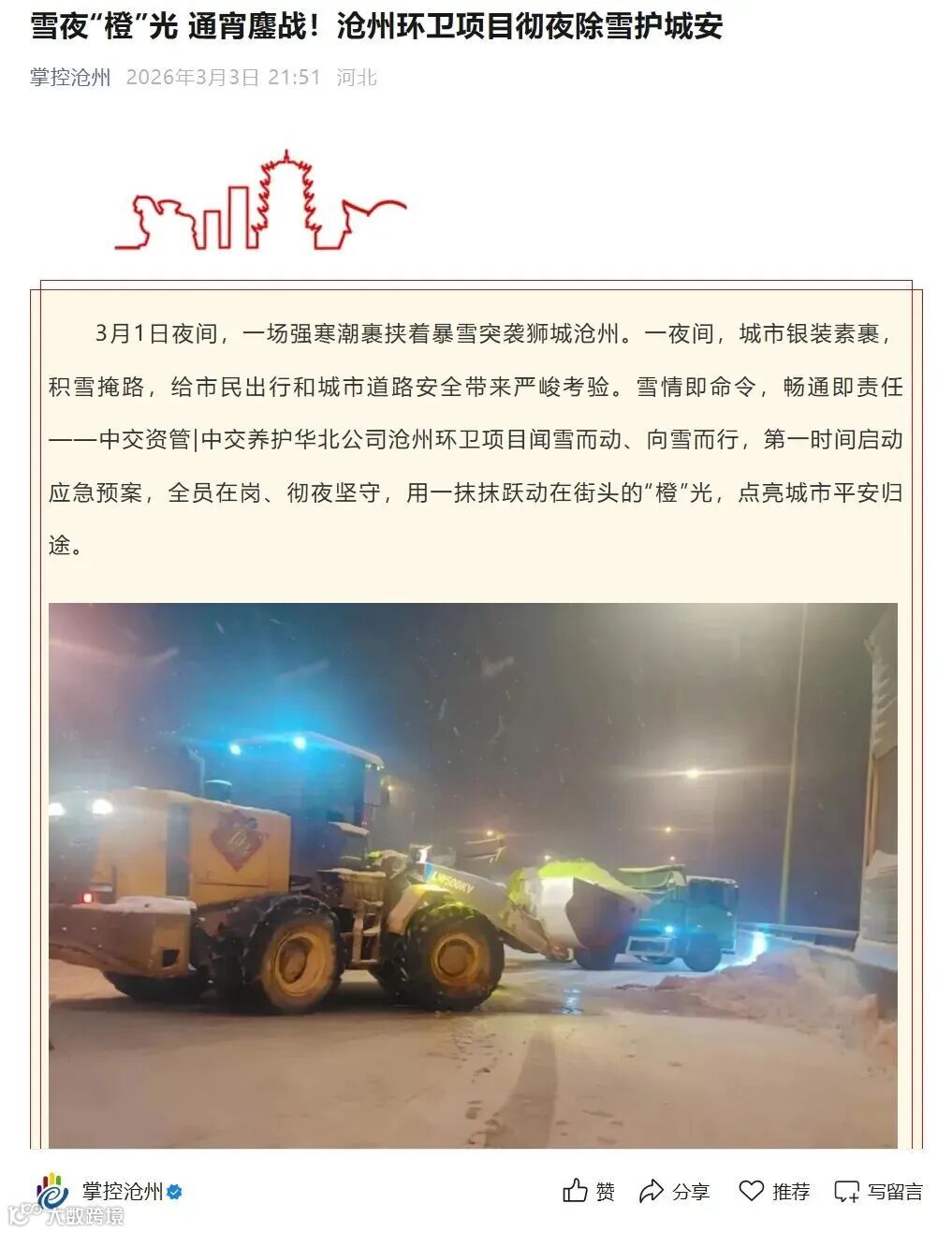 3月3日,《沧州日报》、“掌控沧州”刊发题为《雪夜“橙”光 通宵鏖战!沧州环卫项目彻夜除雪护城安》文章,概述了公司沧州环卫项目闻雪而动、向雪而行,第一时间启动应急预案,全员在岗、彻夜坚守,用一抹抹跃动在街头的“橙”光,点亮城市平安归途。一起来看!