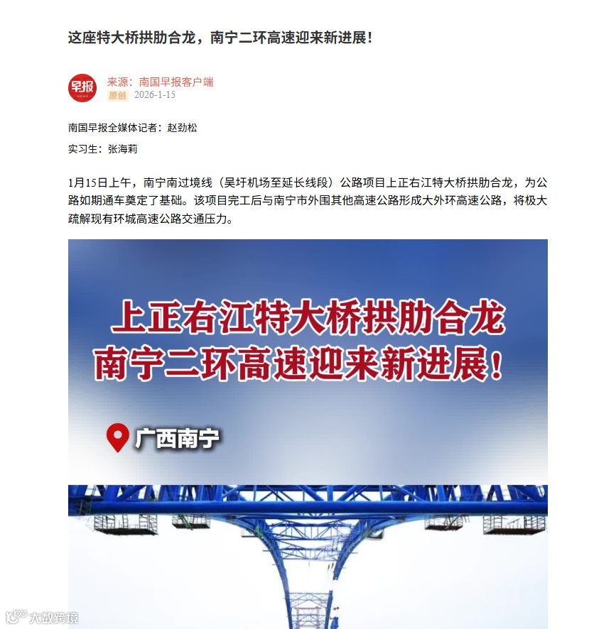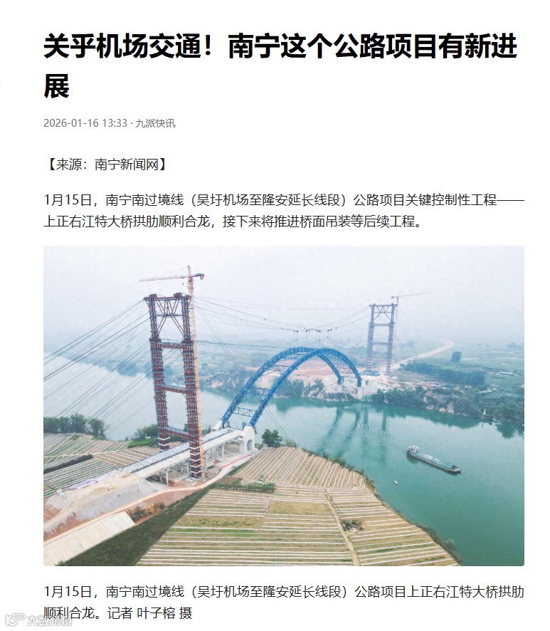 近日,人民网、中国新闻网、南宁日报、南国早报、南宁新闻网、今日头条等多家媒体关注报道公司参建的南宁南过境线关键控制性工程上正右江特大桥拱肋合龙!