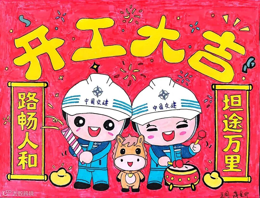 作品简介:以马年为背景,绘有中交娃娃与萌趣小马,红底黄字搭配“路畅人和”“坦途万里”对联,喜庆热烈,既彰显中交人筑路通途的使命,也传递出开工奋进的美好期许。