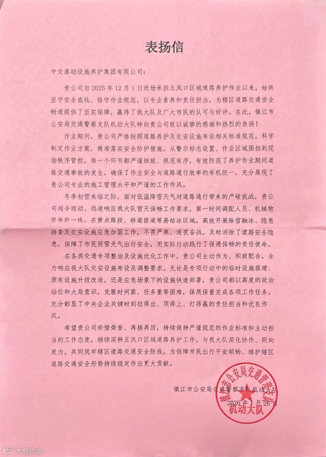近日,镇江市公安局交通警察支队机动大队发来表扬信,对公司镇江片区养护项目展现出的高度专业素养与强烈责任担当致以感谢与赞扬。