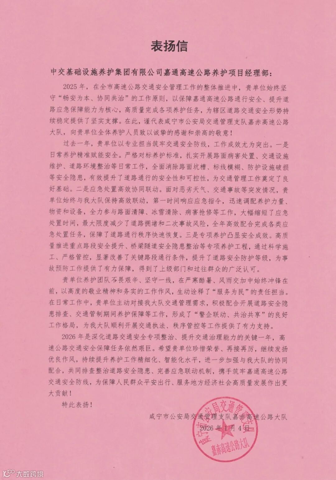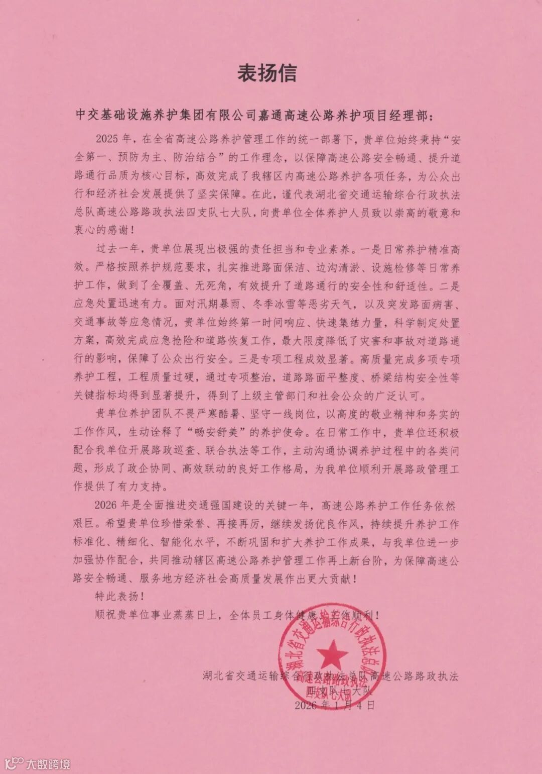 近日,湖北省交通运输综合行政执法总队高速公路路政执法四支队七大队、咸宁市公安局交通管理支队嘉赤高速公路大队相继发来表扬信,对公司嘉通高速公路养护项目经理部2025年以卓越的专业素养和央企担当,有力保障高速公路安全畅通致以诚挚感谢。