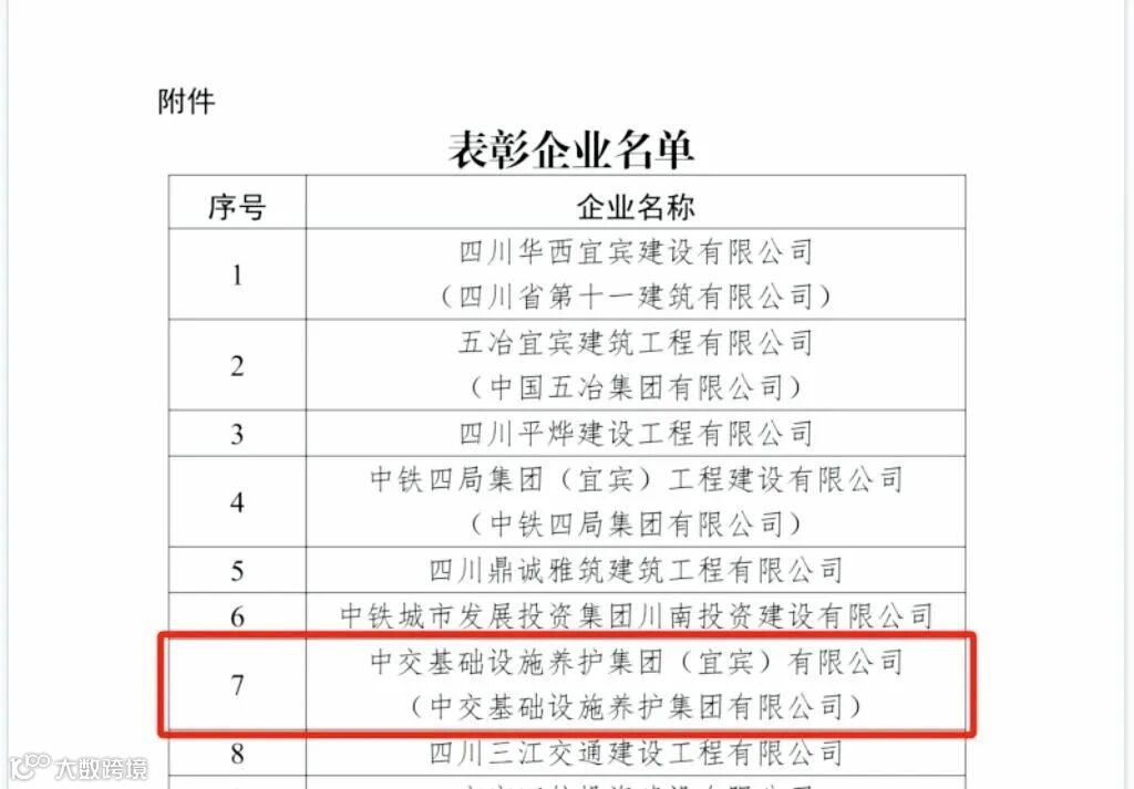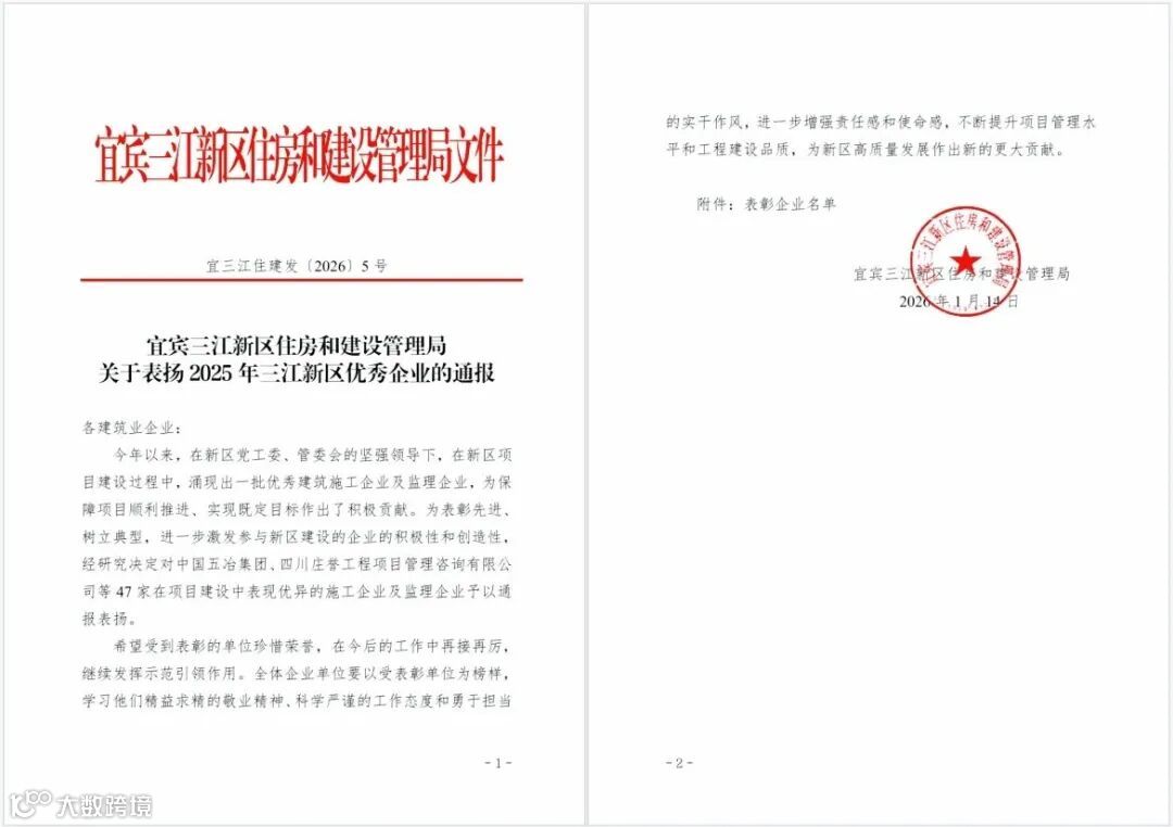 近日,宜宾三江新区住房和建设管理局发布《关于表扬2025年三江新区优秀企业的通报》,凭借三江片区项目部在新区建设中的优异表现,公司成功获评2025年三江新区优秀企业,获官方通报表扬。