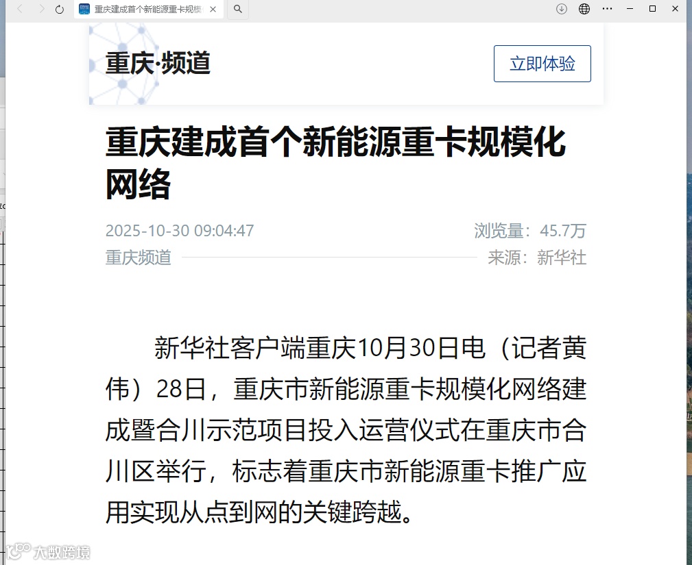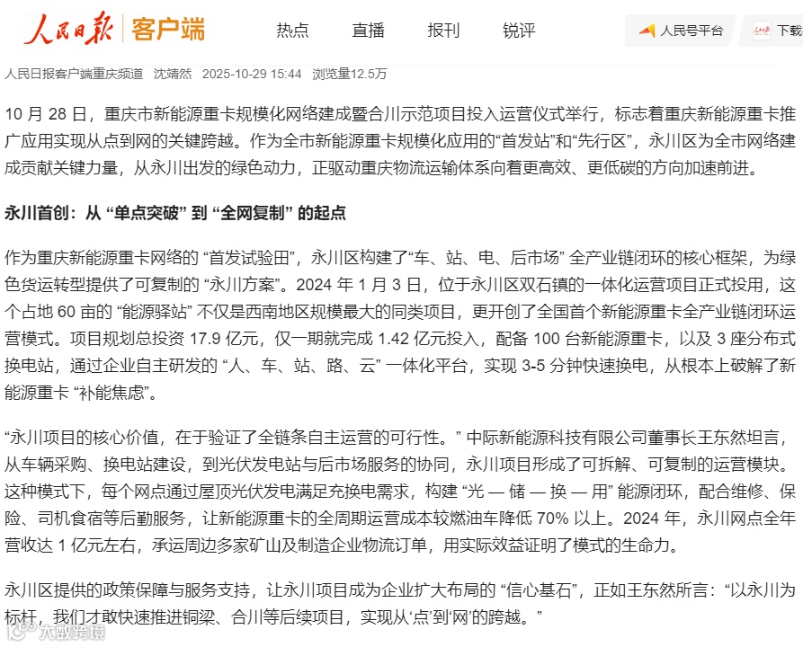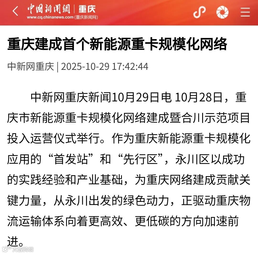 10月28日,位于重庆铜合高速九峰山场地的“重庆市新能源重卡规模化网络建成暨合川示范项目”投入运营,标志着我国首个新能源重卡规模化网络正式形成。人民日报、新华网、中国新闻网、重庆日报等多家主流媒体聚焦报道。