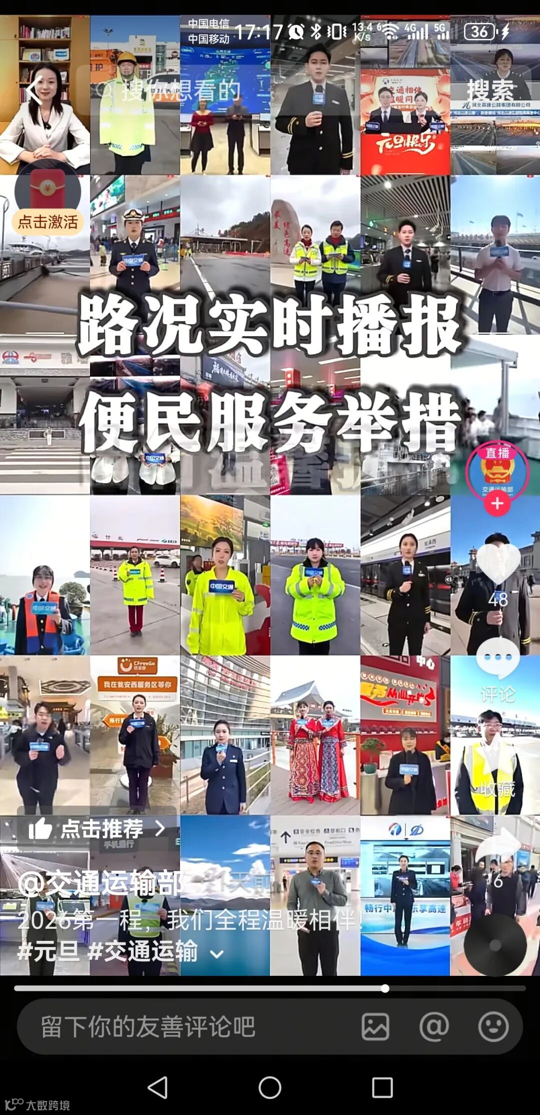 2025年12月31日—2026年1月3日,交通运输部举办“交通相伴,温暖出行”2026元旦假期出行服务全景直播,旨在全方位、多角度为公众提供精准、实用的出行信息,营造安全、便捷、温馨的出行环境。公司贵州总部“黔路智友珙桐花”团队积极响应号召,迅速行动,精心组织,团队成员担任主播,全力投入到此次意义重大的直播活动当中,聚焦元旦假期出行热点,全方位展示服务区关怀、收费站科技赋能、集中监控数智中心智慧调度,为出行群众筑牢安全便捷的出行防线。此次直播活动还获人民日报客户端和央视频全程转播。