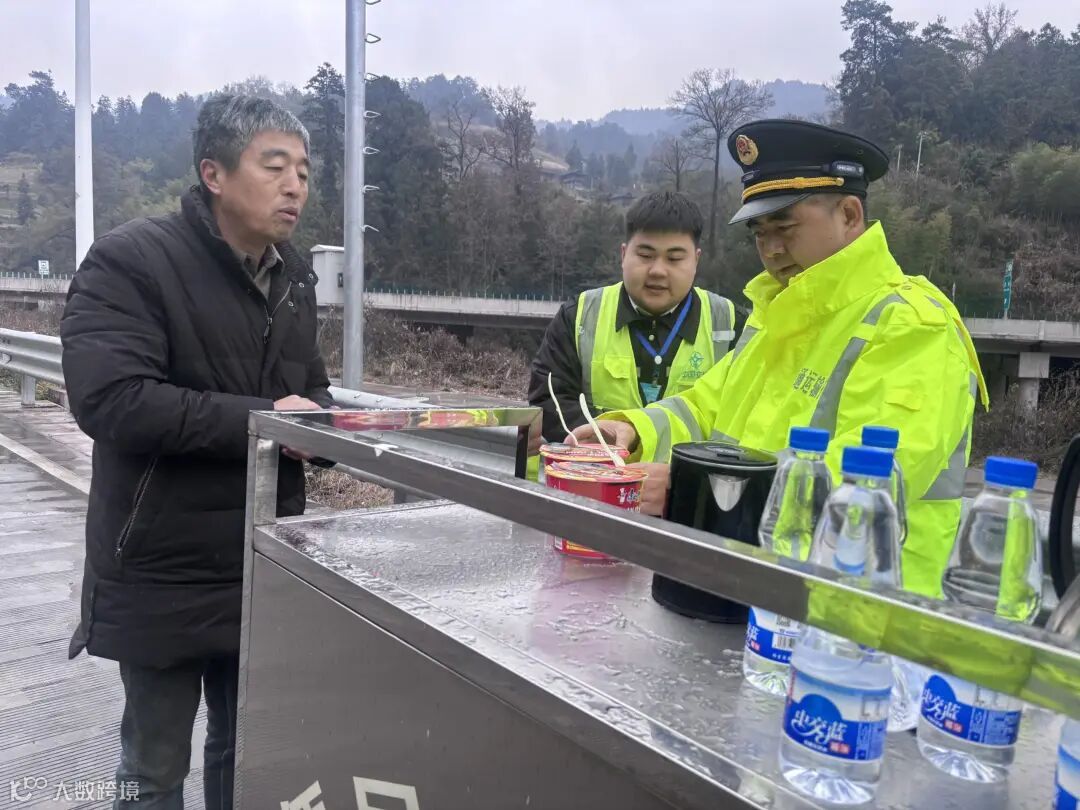“师傅,您先别着急,我们这儿有热水和泡面。”稳定好驾驶员情绪后,当班班长吴鹏立即将情况上报。短短几分钟内,青阳收费站联合黔东南综合行政执法七支队启动便民服务响应,一场冬日里的暖心援助迅速展开。