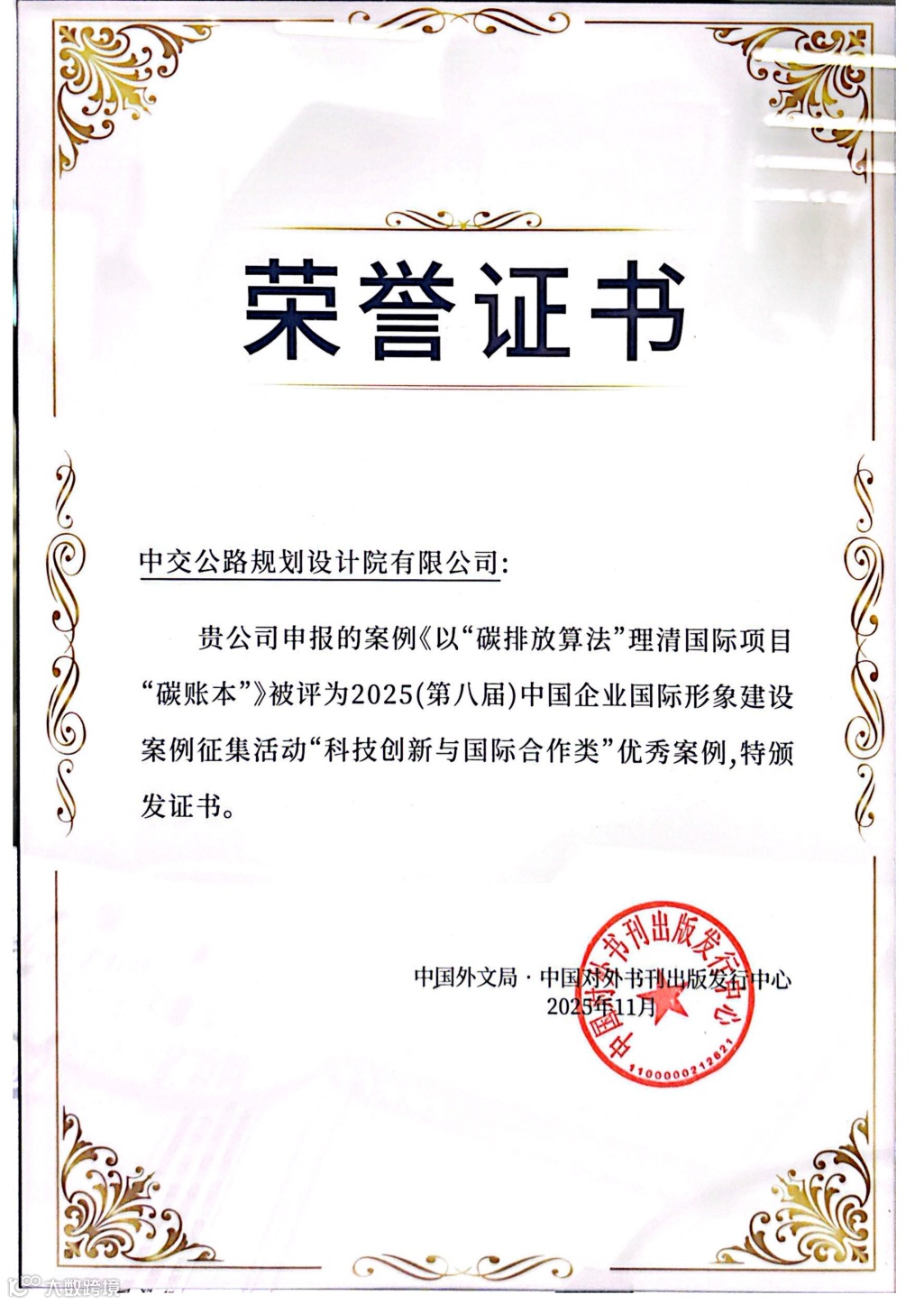 11月9日,由中央宣传部、国务院国资委、全国工商联等部门指导,中国外文局主办的2025中国企业全球形象高峰论坛在安徽合肥举办。中交集团党委副书记刘翔出席论坛并发言。论坛现场揭晓了“2025(第八届)中国企业国际形象建设案例征集活动”的评选结果,中交集团申报案例入选1个“十大优秀案例”,5个“优秀案例”。