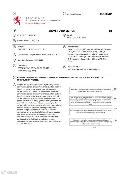 近年来,欧盟、英国、美国等发达国家对基建工程碳排放管理日益关注。而联合国政府间气候变化专门委员会(简称“IPCC”)的碳排放计算通用方法与我国公路建设管理模式及数据基础不相适应,无法满足我国企业在国际项目中履行碳排放量化管理要求。为此,中交公规院自主研发了“一种基于建设工序的公路工程建设期碳排放量计算方法”,并于2025年4月获得卢森堡政府经济部授权的发明专利,标志着该成果在气候变化研究最前沿的欧洲国家获得认可。目前该成果已在十余个海外公路工程中成功应用,显著提升了中交集团在碳排放管理领域的领先地位和话语权,助力集团公路建设业务在欧洲市场的合规化、本地化推进,有力为全球化战略布局提供绿色低碳转型支持。