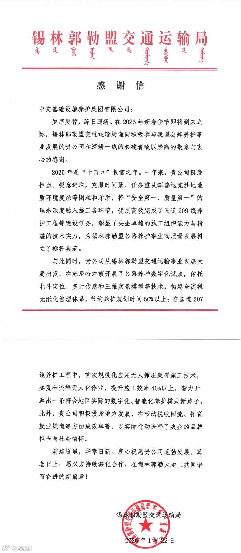 近日,锡林郭勒盟交通运输局向公司发来感谢信,对公司2025年在当地公路养护事业中的突出贡献表示衷心感谢。