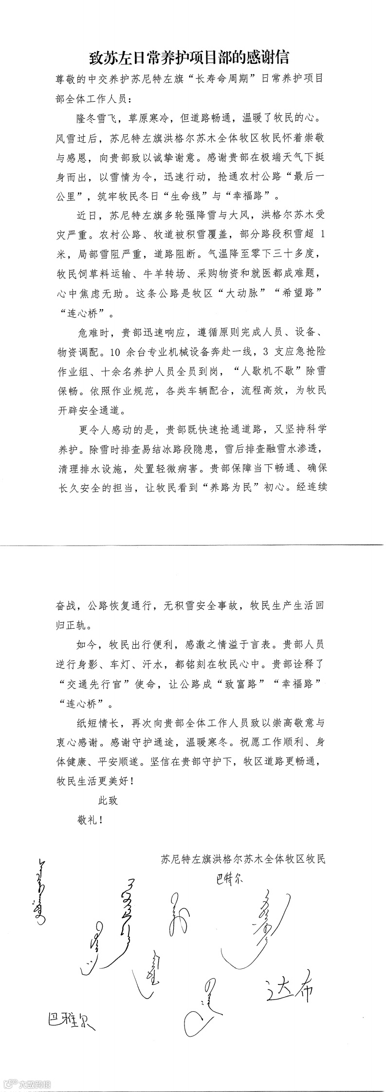 近日,公司苏尼特左旗“长寿命周期”日常养护项目部收到了一封来自洪格尔苏木全体牧民的感谢信,信中对项目部在极端风雪天气中迅速抢通农村公路、保障牧民生产生活致以崇高敬意与真挚感谢。