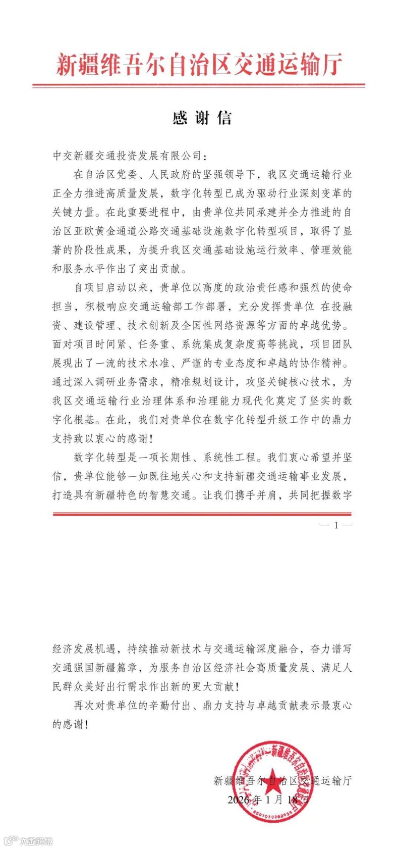 近日,公司收到新疆维吾尔自治区交通运输厅发来的感谢信。信中指出,由公司承建并全力推进的自治区亚欧黄金通道公路交通基础设施数字化转型项目,取得了显著的阶段性成果,为提升自治区交通基础设施运行效率、管理效能和服务水平作出了突出贡献。