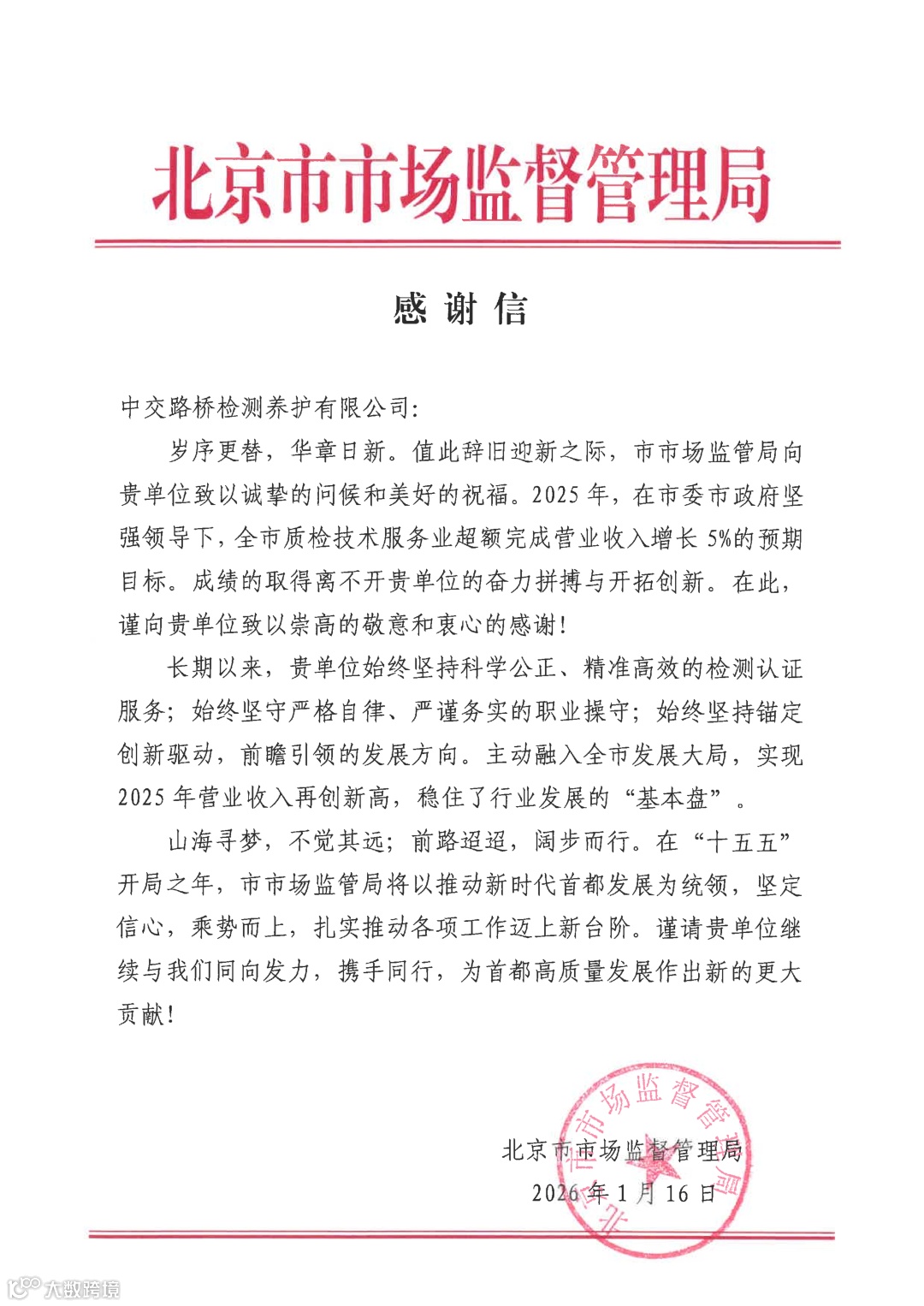 近日,北京市市场监督管理局向公司发来感谢信,对公司2025年为全市质检技术服务业发展作出的积极贡献表示肯定与感谢。
