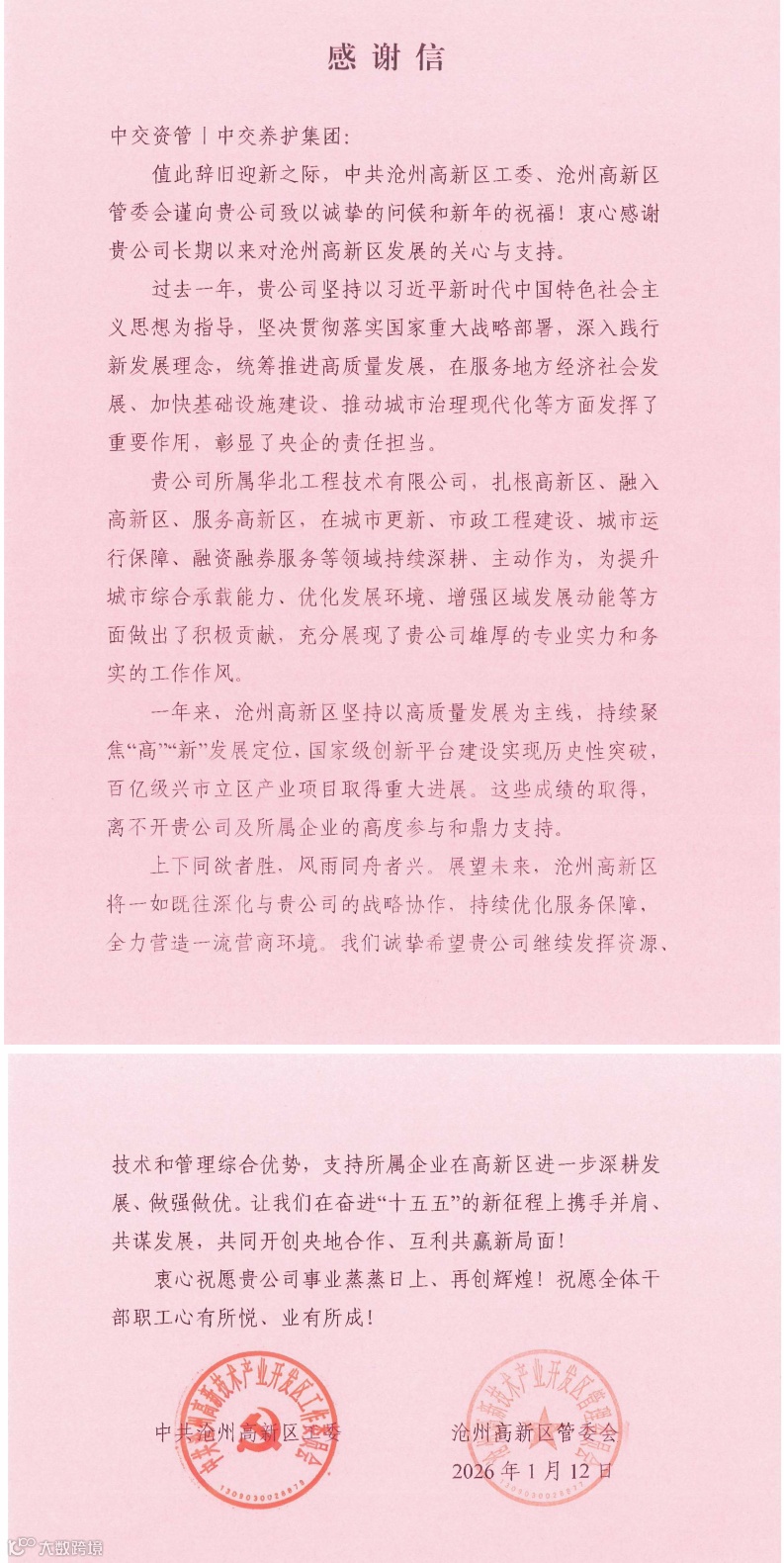 近日,公司收到中共沧州高新区工委、沧州高新区管委会发来的感谢信,对长期以来支持高新区发展表示衷心感谢,并致以新年问候。过去一年,公司积极服务地方发展,在基础设施建设、城市治理现代化等方面发挥了重要作用。沧州高新区表示将一如既往深化与公司的战略协作,持续优化营商环境,希望公司继续发挥综合优势,推动所属企业在高新区进一步做强做优,共同开创“十五五”期间央地合作、互利共赢新局面。