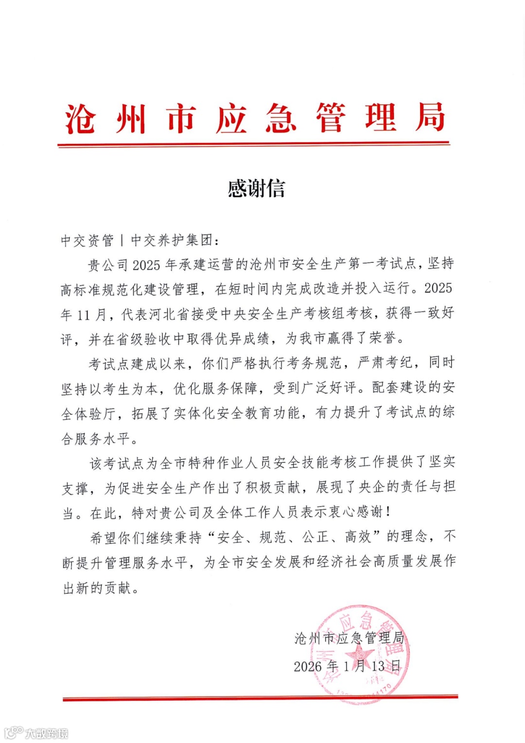 近日,沧州市应急管理局向公司发来感谢信,特别表扬公司2025年承建运营的沧州市安全生产第一考试点在各级考核中取得的优异成绩。该考试点坚持高标准建设管理,在短时间内完成改造并投入运行,于2025年11月代表河北省接受中央安全生产考核组考核,获得一致好评,并在省级验收中取得优异成绩,为沧州市赢得了荣誉。