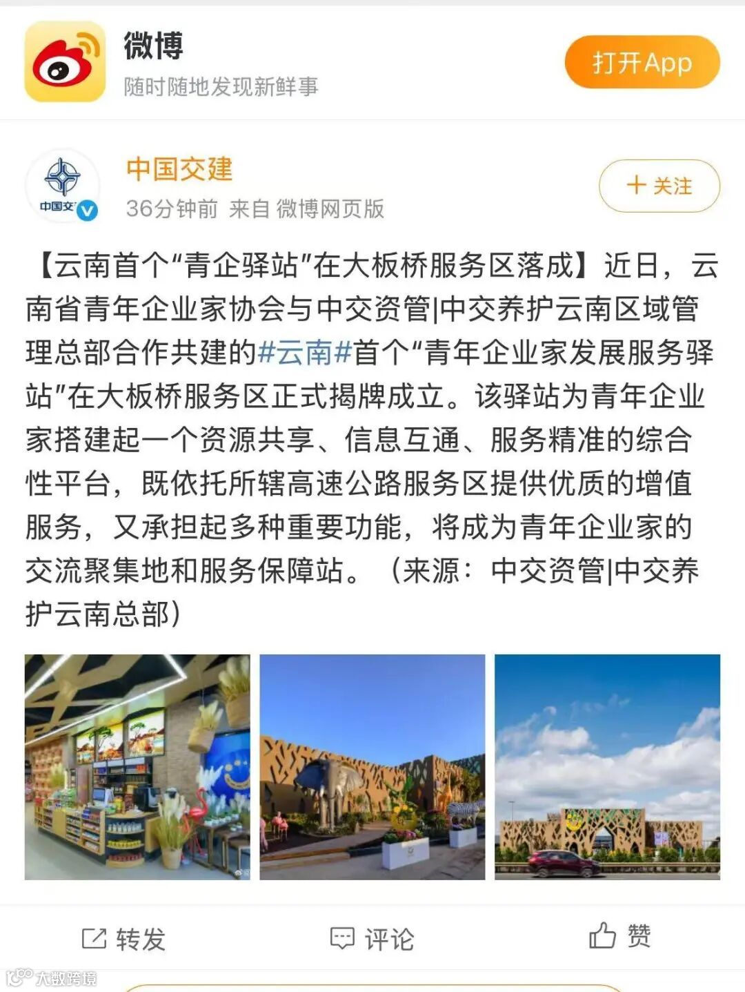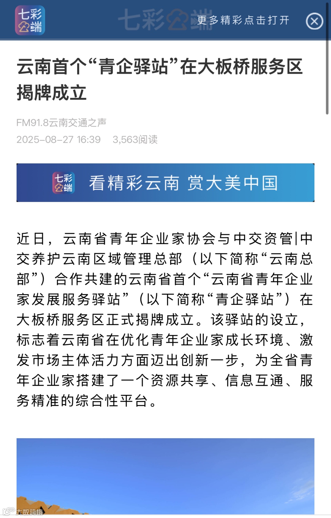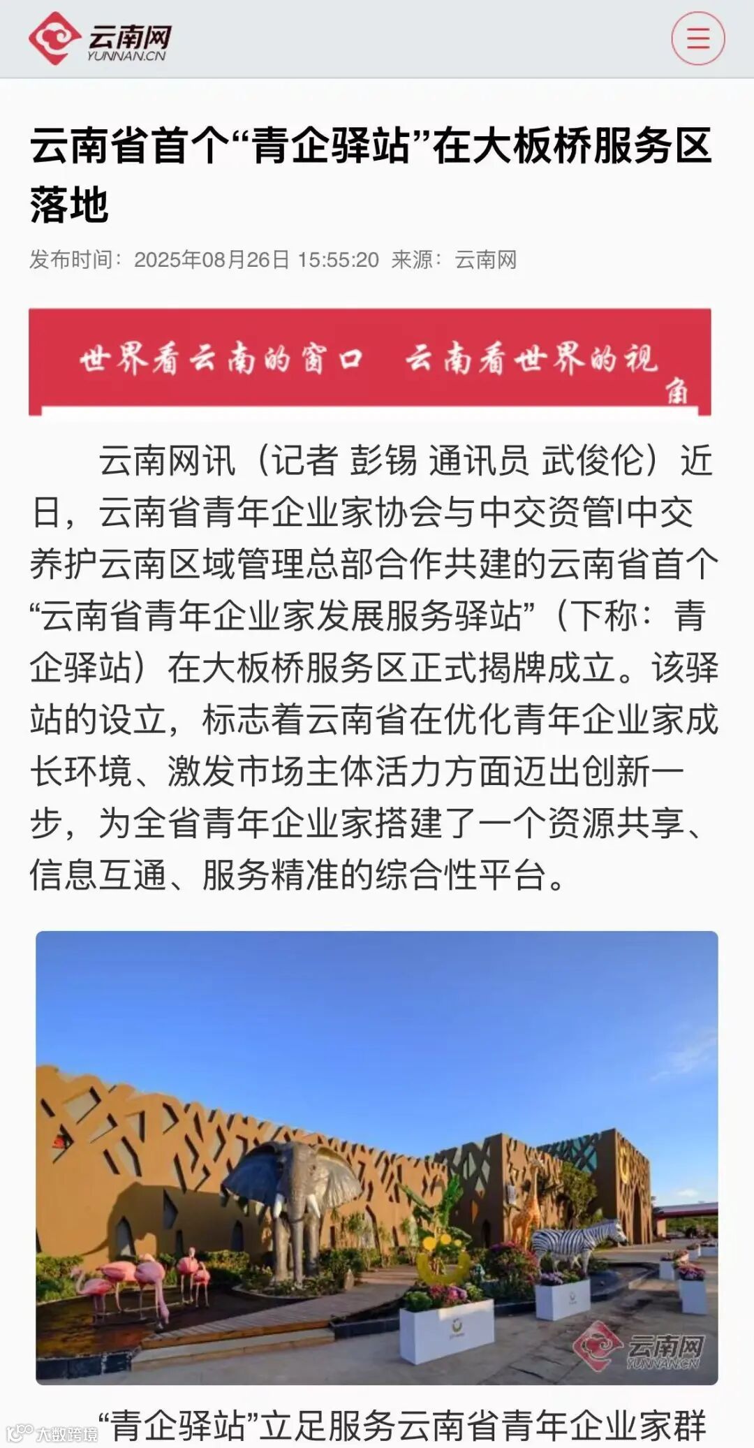 近日,云南省青年企业家协会与中交资管|中交养护云南区域管理总部合作共建的云南省首个“云南省青年企业家发展服务驿站”(以下简称“青企驿站”)在大板桥服务区正式揭牌成立。该驿站的设立是云南省团委与中交资管|中交养护云南区域管理总部团委互惠共赢、共谋发展的重要举措,标志着云南省在优化青年企业家成长环境、激发市场主体活力方面迈出创新一步,为全省青年企业家搭建了一个资源共享、信息互通、服务精准的综合性平台。