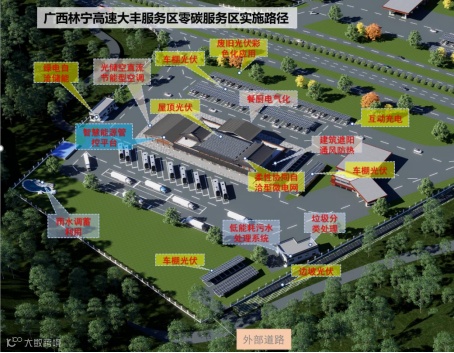 林宁高速大丰服务区主要通过涵盖分布式光伏发电、储能、直流负载和交直流配电网的高速公路服务区“光-储-直-柔”一体化系统,开展服务区低碳污水处理与节水回用等技术,实现零碳服务区建设。项目突出全生命周期加强降碳理念,多项创新技术赋能,深度融合广西地域特色、面向东盟,对各地开发符合自身特色的零碳服务区具有重要示范意义。