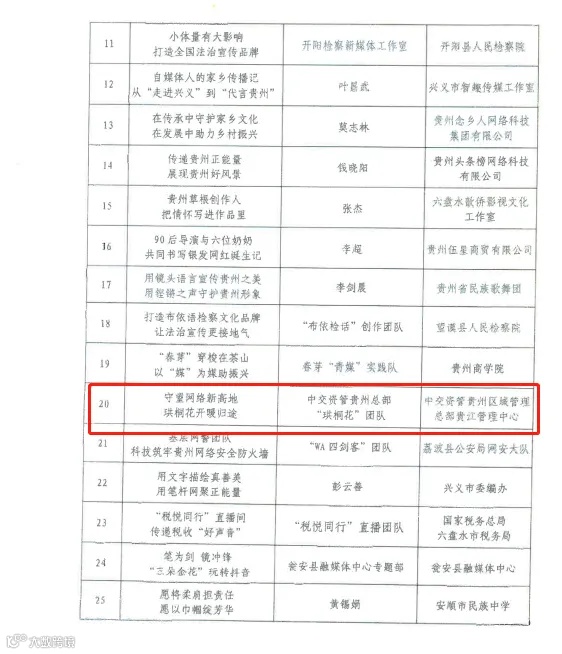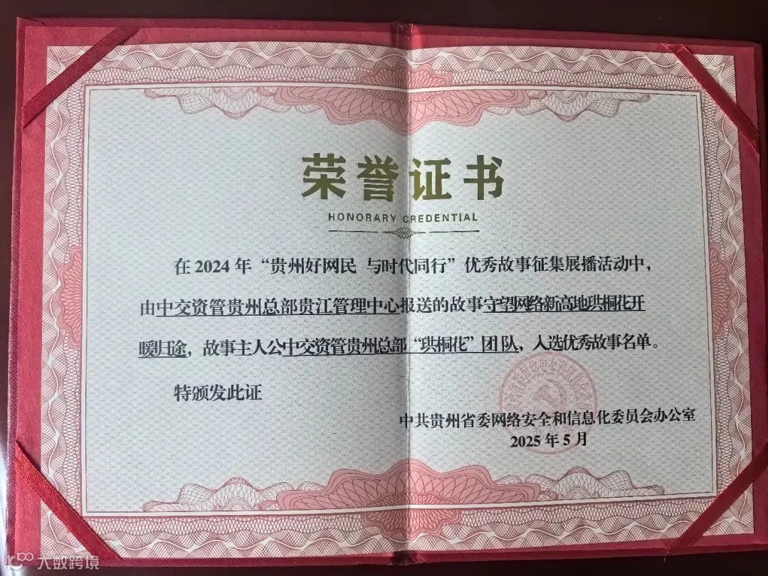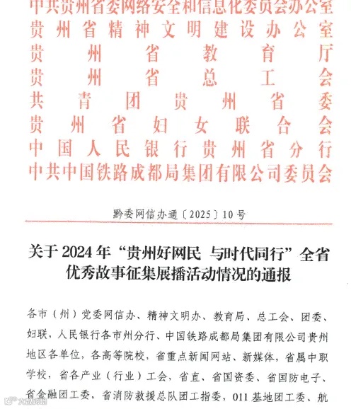 近日,由贵州省委网信办、贵州省精神文明办、贵州省教育厅、贵州省总工会、共青团贵州省委、贵州省妇联等多家单位联合举办的2024年“贵州好网民 与时代同行”优秀故事征集活动结果公布。贵江管理中心撰写的“黔路智友珙桐花”团队故事《守望网络新高地 珙桐花开暖归途》从200余个征集故事中脱颖而出,入选2024年“贵州好网民 与时代同行”优秀故事。