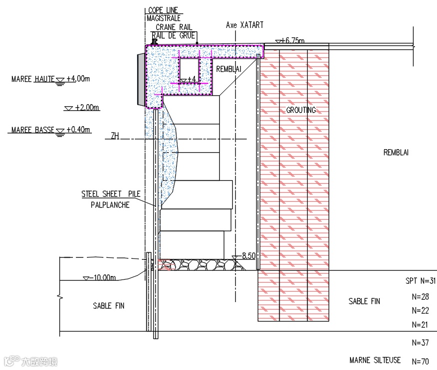 卡萨布兰卡港磷酸盐码头始建于1928年,近百年岁月与海水环境侵蚀,使得这位“百岁老人”伤痕累累:临海测的钢板桩腐蚀严重,局部锁扣失效、板桩后方填充混凝土遭严重淘刷甚至掏空,部分区域混凝土方块亦出现破损;码头胸墙混凝土表面出现破损、剥离、内部钢筋暴露锈蚀;系船柱、护舷等设施老化变形,亟需一场彻底的、高标准的“焕新”手术让码头重焕新生。