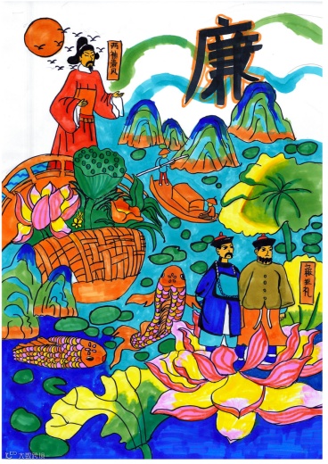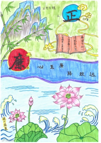 作品描绘了波浪、河流等象征艰难险阻的事物,被莲花、翠竹等象征廉洁之物包围,远处的青山则意喻丰硕成果,生动形象的表达路虽艰、远,但只要秉持廉洁精神,恪守廉洁从业之心,一定能行至远方,收获丰硕的成果。