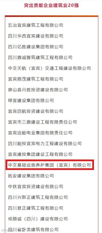 会议现场发布“宜宾市2024年度产业发展突出贡献企业榜单”,中交基础设施养护集团(宜宾)有限公司荣获宜宾市2024年度产业发展突出贡献企业,荣登宜宾市2024年度产业发展突出贡献建筑业20强。