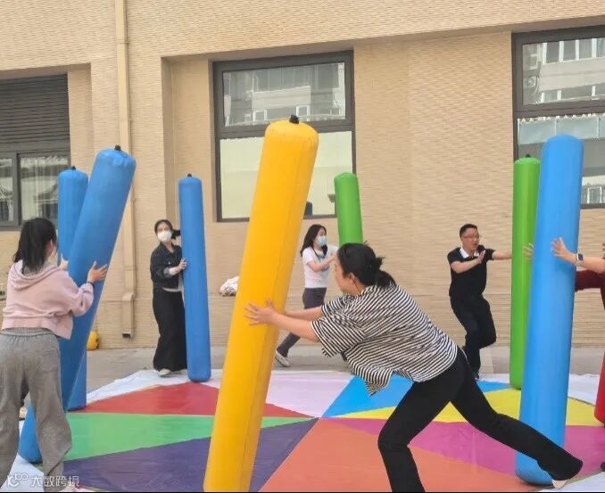 “不倒森林”比赛中,队员们默契十足,伴随着统一的口号声,屏息凝神跨步换位,在彩柱倾斜的瞬间稳稳托住柱身。额角的汗珠与飞扬的笑声交织,六十秒里每个人都是团队链条上最可靠的螺丝钉。