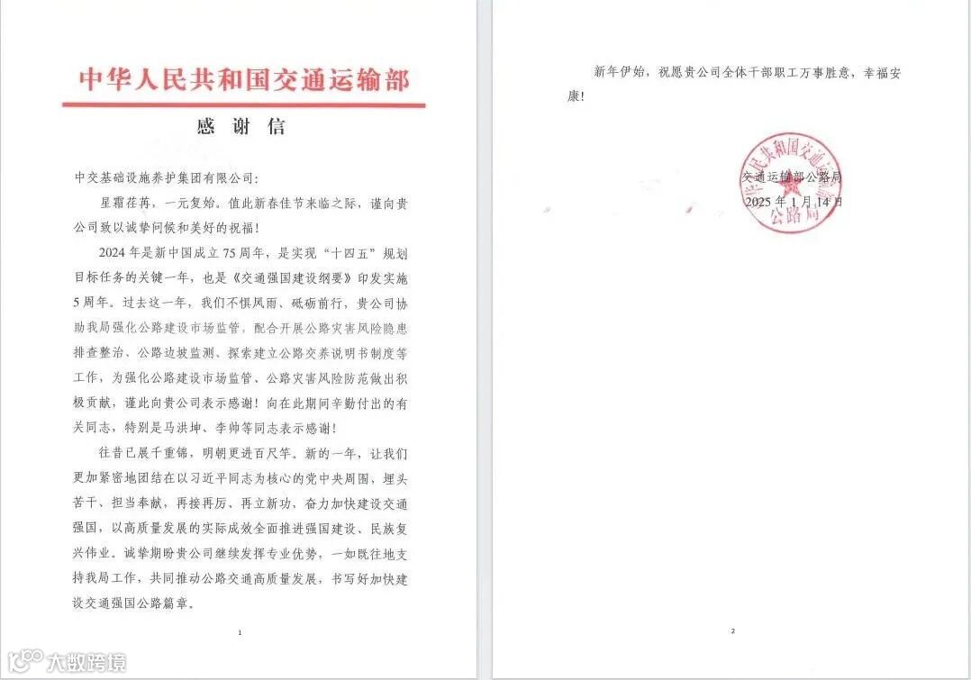 近日,交通运输部发来感谢信,对公司配合开展公路灾害风险隐患排查整治、公路边坡监测、探索建立公路交养说明书制度等工作,为强化公路建设市场监管、公路灾害风险防范做出积极贡献表示感谢。