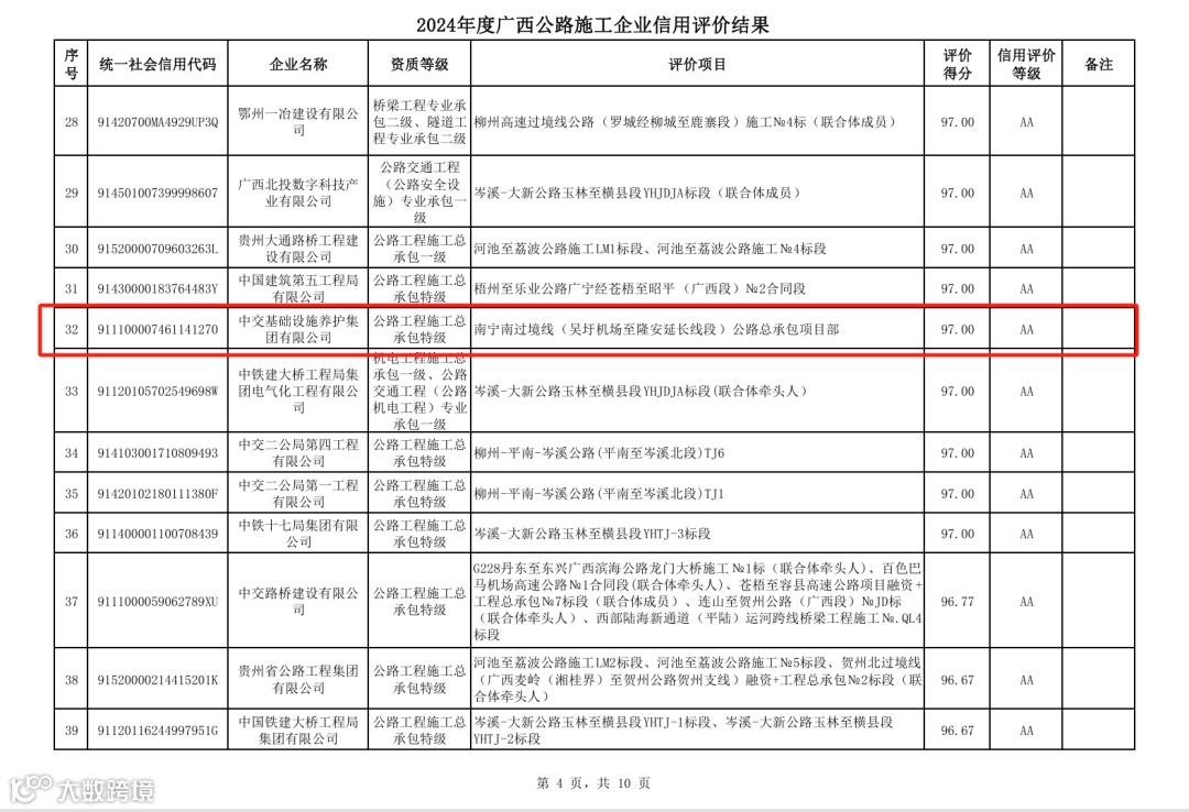 近日,广西壮族自治区 2024 年公路工程施工企业信用评价结果公示完成,公司以97分的高分荣获AA级信用评价,彰显了公司在公路建设领域的卓越实力和良好信誉。