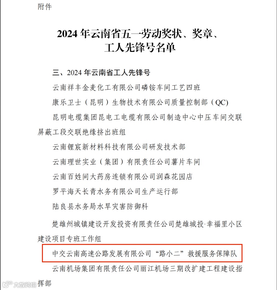 近日,云南省总工会、云南省人力资源和社会保障厅印发了《关于表彰 2024 年云南省五一劳动奖状、奖章、工人先锋号的决定》,公司所属云南总部“路小二”救援服务保障队荣获云南省工人先锋号。