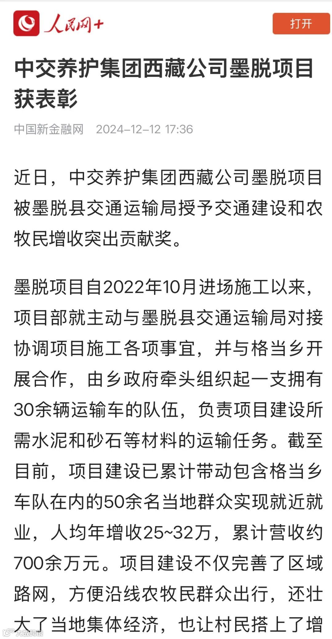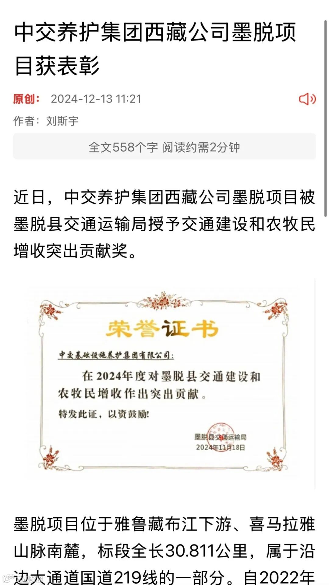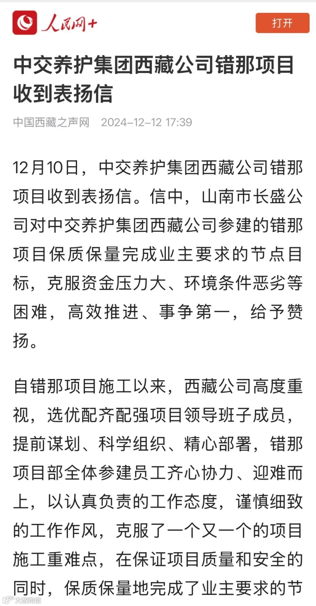 12月10日,西藏公司错那项目收到表扬信。信中,山南市长盛公司对中交养护集团西藏公司参建的错那项目保质保量完成业主要求的节点目标,克服资金压力大、环境条件恶劣等困难,高效推进、事争第一,给予赞扬。