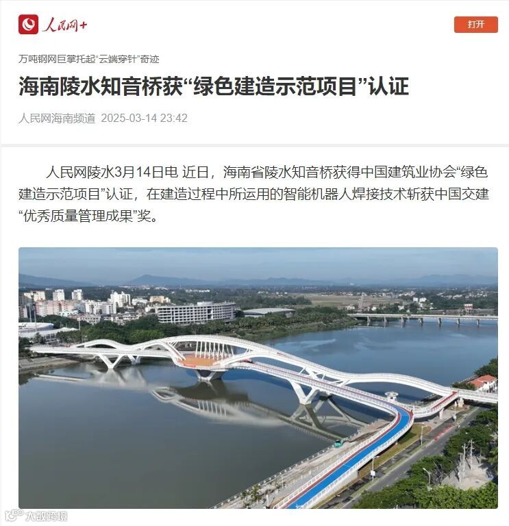 导读:媒体关注|人民网、今日头条等媒体报道万吨钢网巨掌托起“云端穿针”奇迹——公司海南陵水知音桥获“绿色建造示范项目”认证