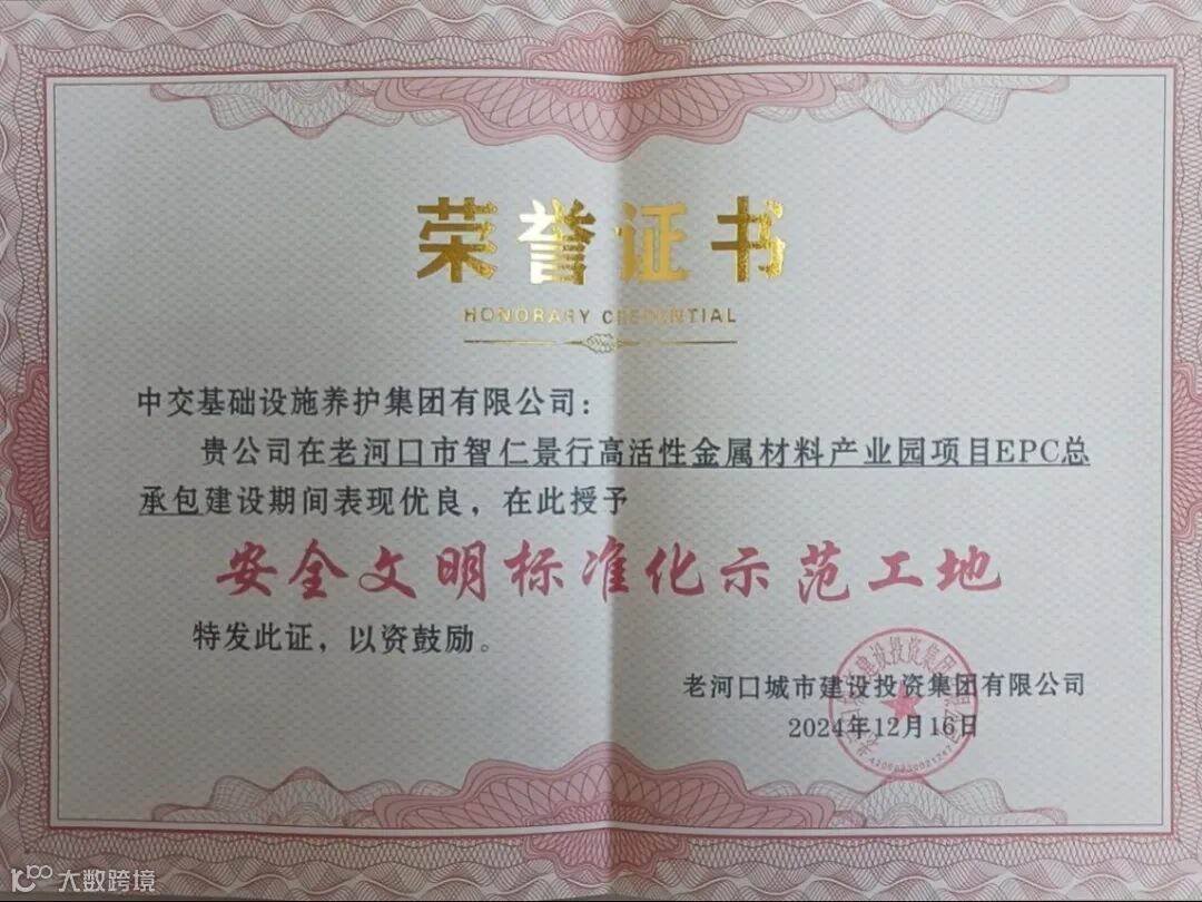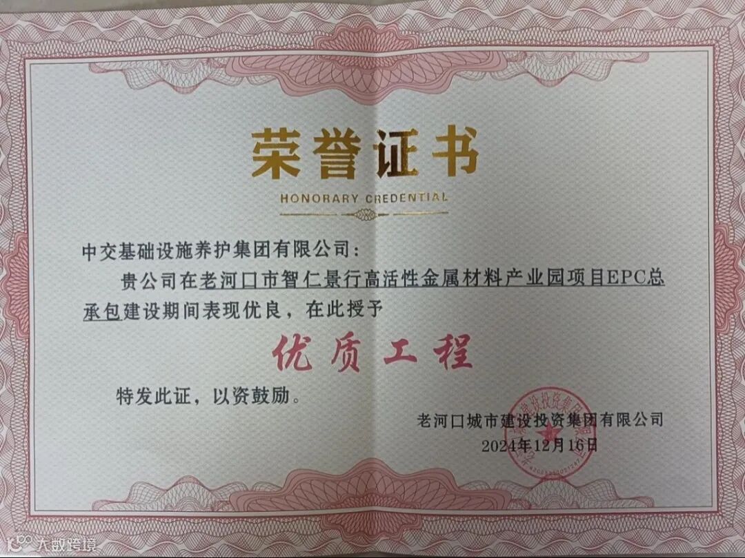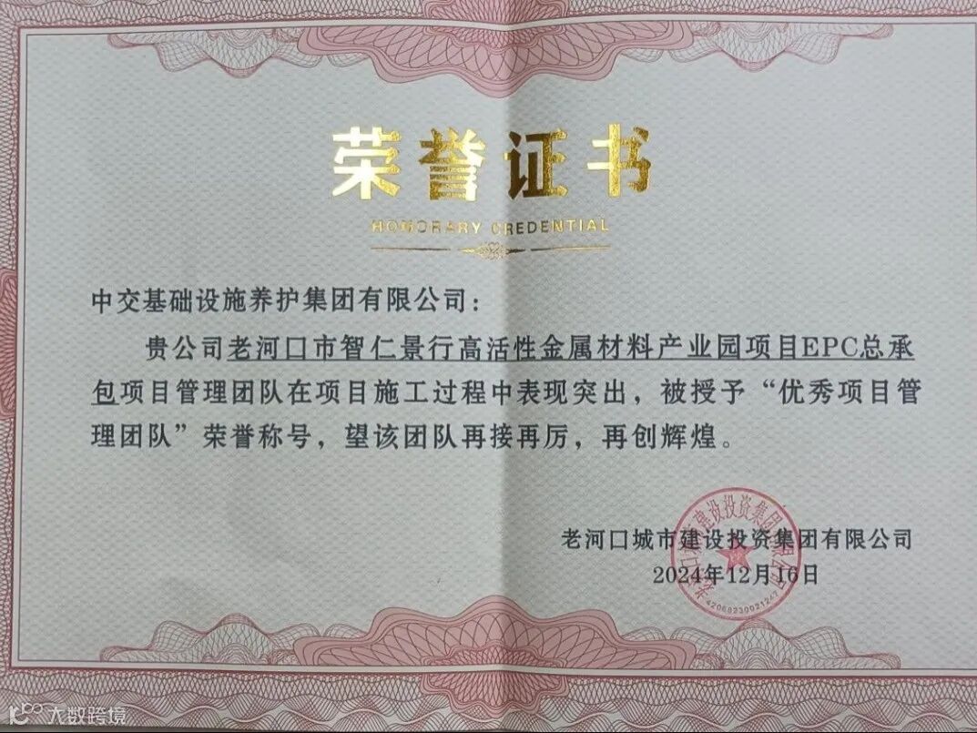 2024年,老河口项目部凭借在智仁景行项目中的卓越表现,成功获得业主单位颁发的“优质工程”“安全文明标准化示范工地”“优秀合作企业”“优秀项目管理团队”荣誉证书,这是对项目团队辛勤付出与专业能力的高度认可。