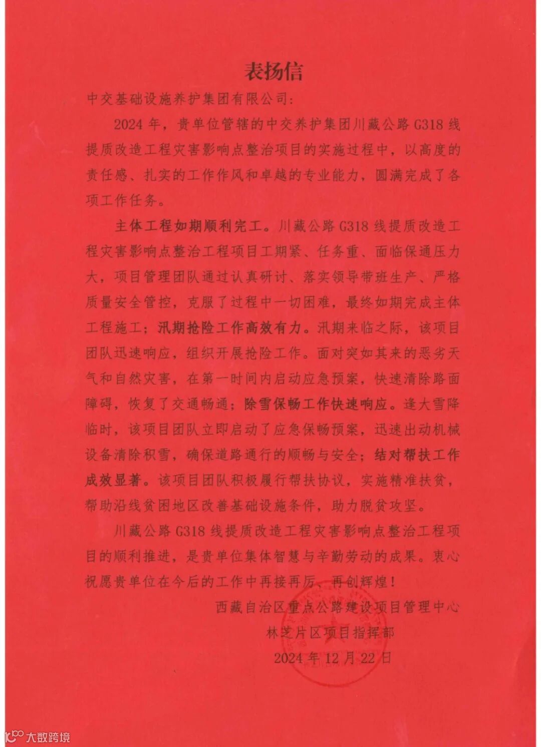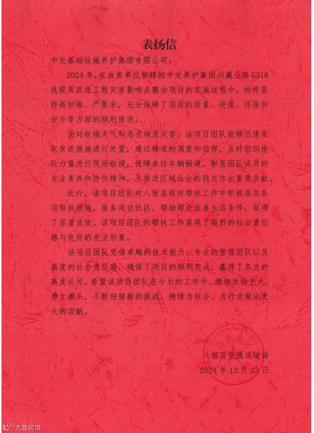 川藏公路G318线灾害整治项目收到业主单位及当地交通局的表扬信,信中对项目团队在主体工程完工、除雪保通、汛期抢险、结对帮扶等方面的表现给予了高度肯定。