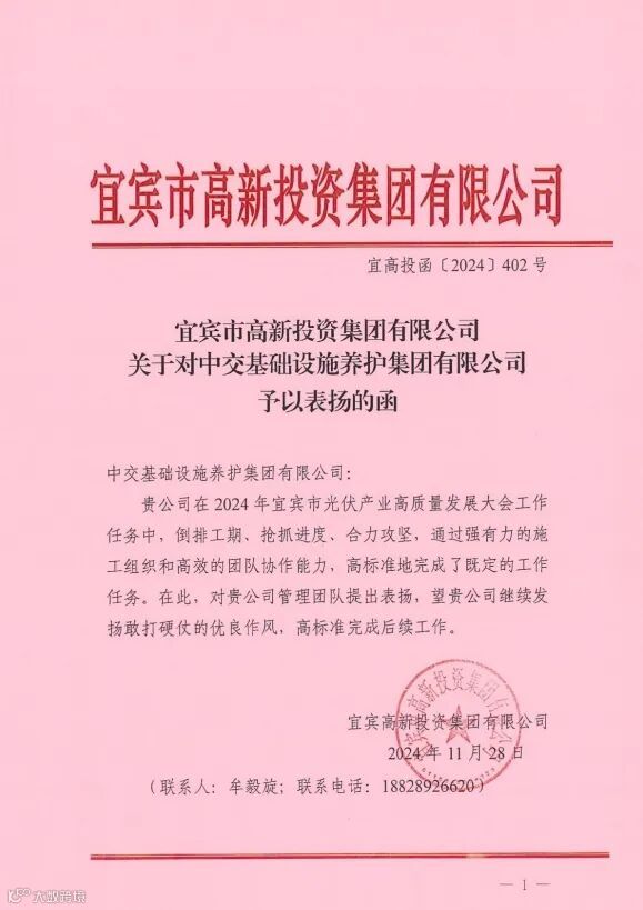近日,宜宾高新片区项目获得业主单位表扬信。来信对宜宾高新片区项目圆满完成2024年宜宾市光伏产业高质量发展大会施工任务提出表扬。