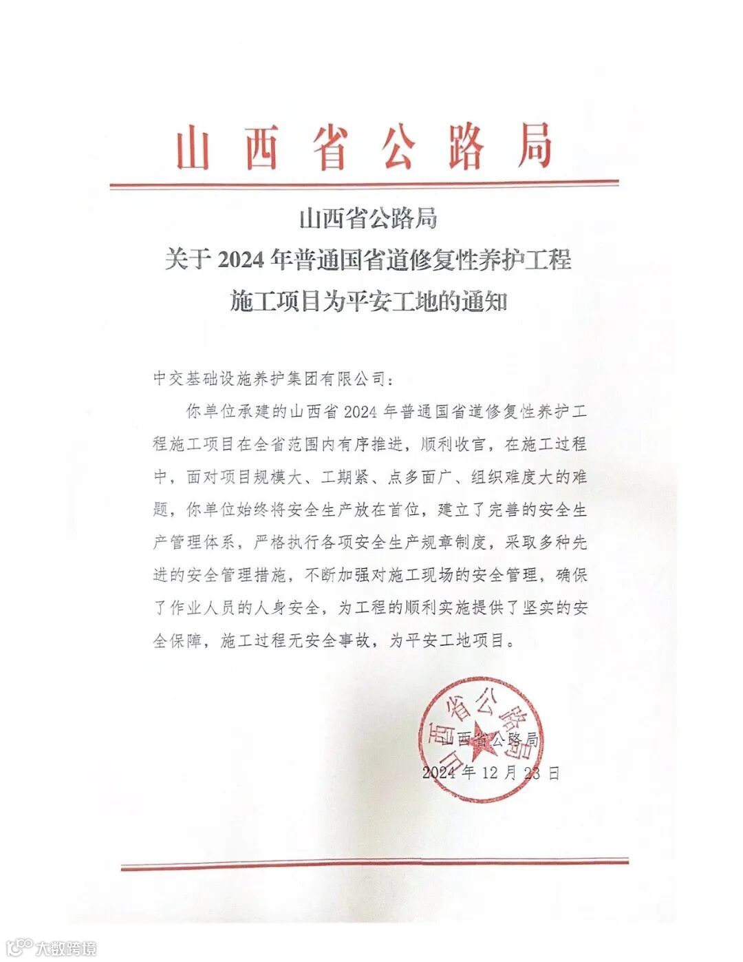 近日,山西省公路局授予公司承建的2024年普通国省道修复性养护工程施工项目“平安工地”称号。这是山西养护项目继荣获山西省公路局大同分局、运城分局等11个分局颁发“平安工地”称号以及太原分局、运城分局颁发“安全生产优秀管理团队”称号之后获得的又一殊荣。