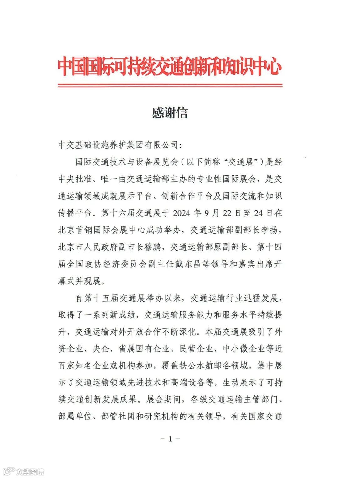 信中提到,本届交通展的成功举办,离不开公司的重视和支持。公司高标准打造的亮点展品,高水平设计的精品展位,高质量组织的特色展期活动,为全面深入呈现可持续交通创新发展新成就提供了坚实保障,也为促进国内外交通运输主管部门、广大行业企业、研究机构加强交流合作,持续推动科技创新和交通产业创新深度融合提供了有力支撑。