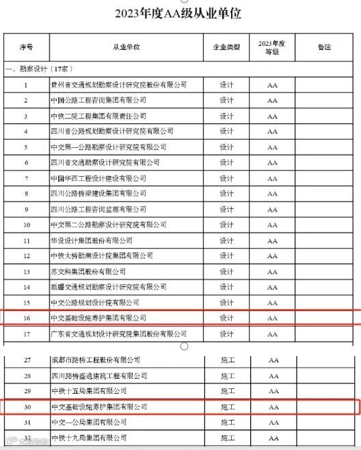 近日,四川省交通运输厅公布了2023年度公路建设企业信用评价结果,公司勘察设计与施工板块均获评“AA”级。