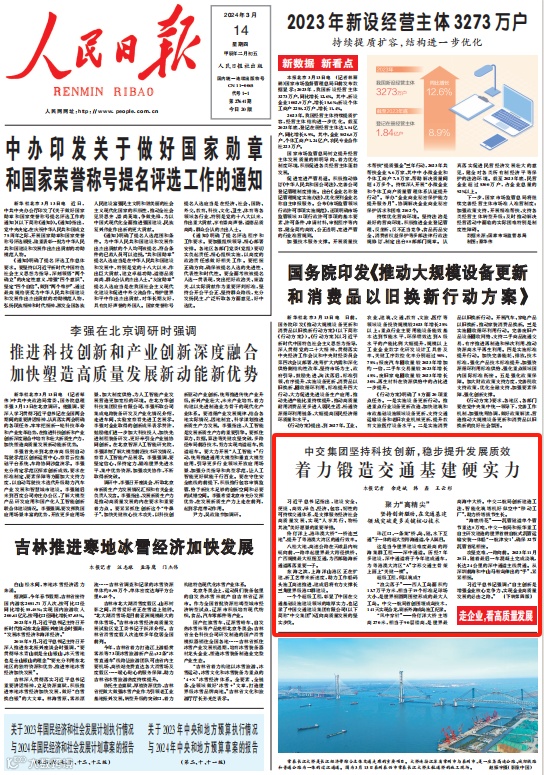 3月14日,《人民日报》头版刊发题为《中交集团坚持科技创新,稳步提升发展质效 着力锻造交通基建硬实力》的报道,详细讲述中交集团在交通基础设施建设领域迈向高质量发展的进展和成就。现将文章转载如下: