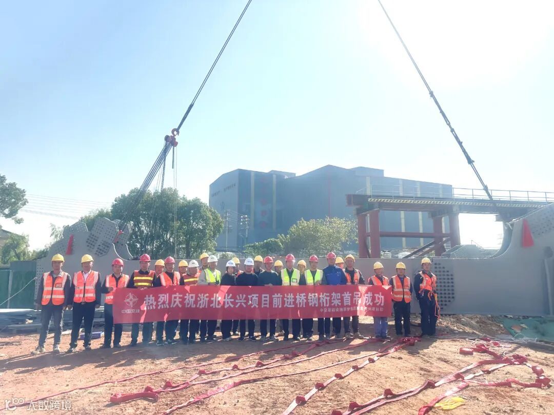 11月20日,在前进桥建设现场数名施工人员的指挥配合下,一榀钢桁架构件经过起吊、定位后,稳稳地落在支架上,标志着前进桥项目钢桁架主梁顶推施工正式拉开序幕。
