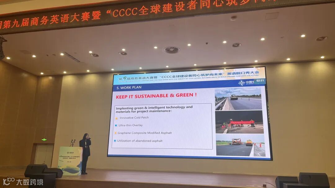 此次比赛共分为创新创效项目推介展示、评委问答、“为全球发展进步注入青春之力”英语脱口秀等环节。常蕴超在第一部分通过对孟加拉邦戈邦都谢赫·穆吉布·拉赫曼隧道运营及维护项目的内容的介绍、中交养护特色的“一体化养护”模式的应用以及国父隧道的建造的意义展现了中交养护人在海外项目的风采;脱口秀部分通过对全球青年、中交青年对于公路工程的贡献,紧扣“一带一路”十周年主题,体现了青年蓬勃的朝气。
