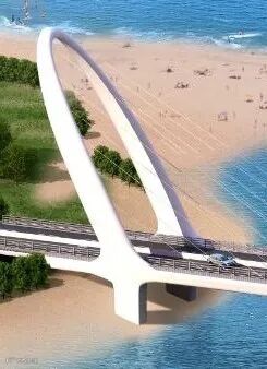 大桥毗邻依山傍海的正门岭大桥,跨越风景秀丽的龙滚河,组成了全线少有的山河海桥景观,“车在景中行,人在画中游”,在此设置一座标志性的景观桥梁,更能够起到画龙点睛的作用。桥址所在区域——万宁素有“中国冲浪之都”的美誉,项目组据此确定了本段旅游路打造河海交融、冲浪戏水的景观节点定位,经过充分调研比选,最终采用以“冲浪”为元素的无背索斜拉桥+弧形索塔设计方案,整体造型犹如航行的帆船帆板,独具张力和动感。象征着在国家大政方针的指引下,海南自贸岛这艘帆船将劈波斩浪、奋勇前行。