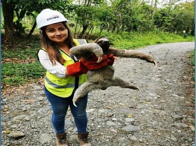 32号公路沿途多为农场、森林和牧场,河流交错,环境优美,施工沿线总有树懒、巨嘴鸟、猴子、蛎蜥和一些叫不上名的野生动物,堪称“32号公路野生动物园”,非常热闹。对动物的影响越少,动物的行为就越自然。项目团队在施工过程中,尽可能不惊扰它们的正常活动,保护桥下动物的栖息环境,严禁故意侵扰它们的生活。树懒是当地野生动物的重要代表,因行动迟缓,且沿线动物通道建设还未完善,他们越过道路或桥面时很容易被往来车辆碾压,因此根据野生动物救助计划,沿线各参建单位定期安排专人进行巡查,一旦发现需要救助的野生动物,项目团队会临时封闭交通,为它们建立安全屏障,对它们及时进行帮助。