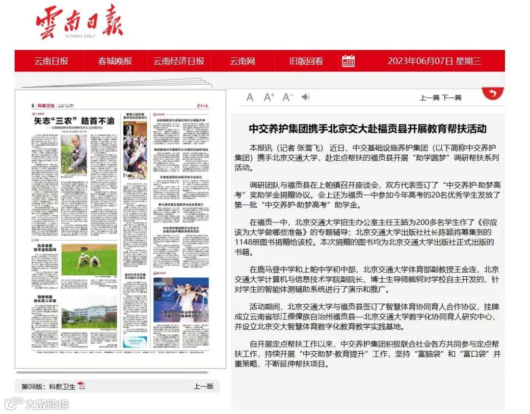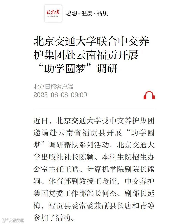 近日,《北京日报》《经济日报》《中国交通新闻网》《新浪教育网》《云南日报》等多家媒体关注报道公司携手北京交通大学,赴定点帮扶的福贡县开展“助学圆梦”调研帮扶系列活动。一起来看~