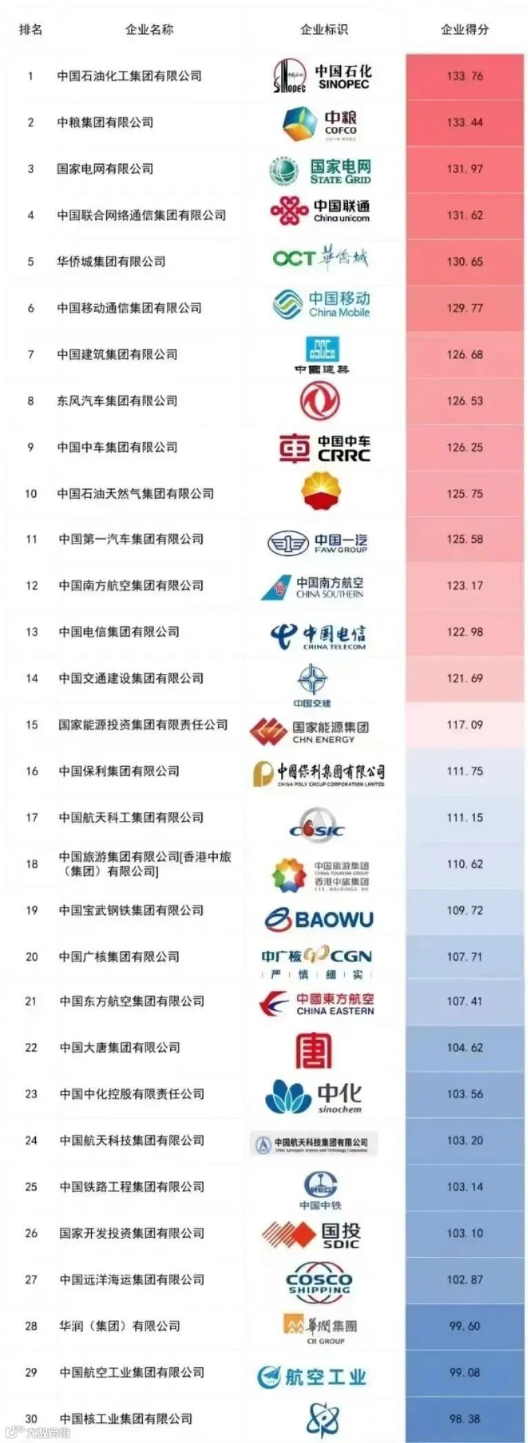 图为2022年度中央企业品牌建设能力TOP30榜单