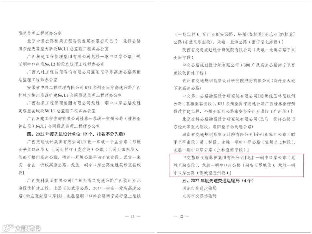 近日,广西壮族自治区交通运输厅发布对2022年度广西高速公路建设先进单位等荣誉的决定,经对龙胜-峒中口岸公路(龙胜至融安段)、龙胜-峒中口岸公路(融安至罗城段)、龙胜-峒中口岸公路(罗城至宜州段)三个项目进行综合考评,评定公司为2022年度先进设计单位。