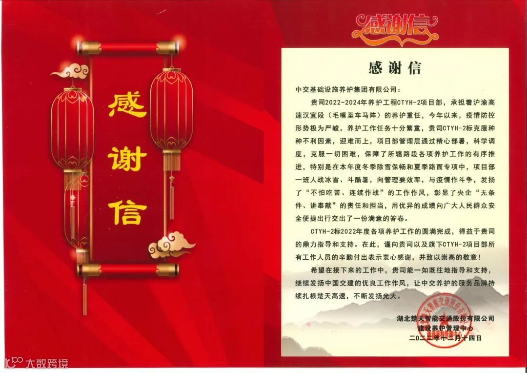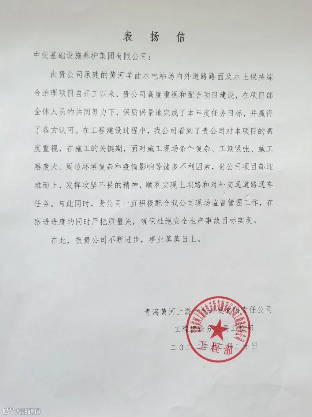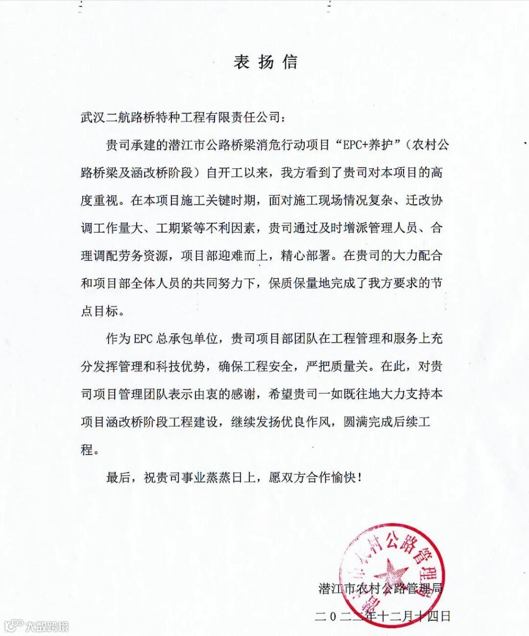 表扬信,是业主单位对项目团队工作的反馈,更是业主单位对公司的肯定。项目团队将继续发扬不怕苦不怕累的工作精神,持续保持高昂的工作激情,高效保质的完成各项既定施工任务,持续发挥公司在桥梁消危领域的综合实力。