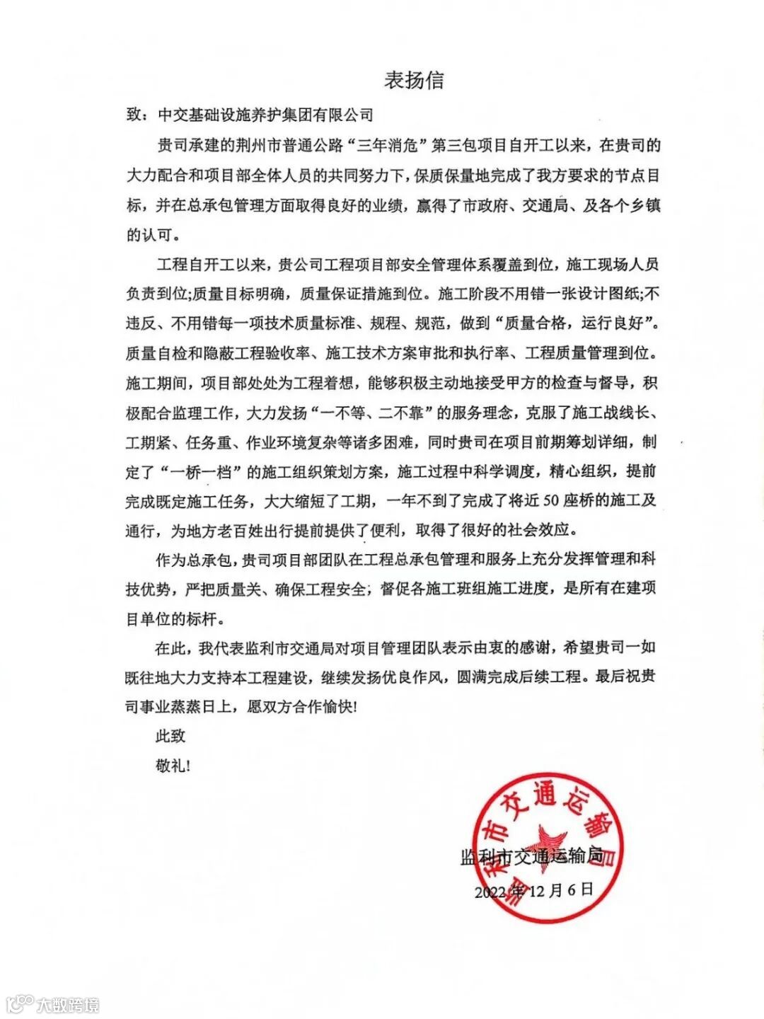 近日,荆州市普通公路桥梁“三年消危”(第三包)公路桥梁改造工程项目收到多封表扬信。信中各业主单位对项目团队勇于攻坚,高响应、高落实、高质量、严把关、全力以赴的工作态度表示高度的赞扬。