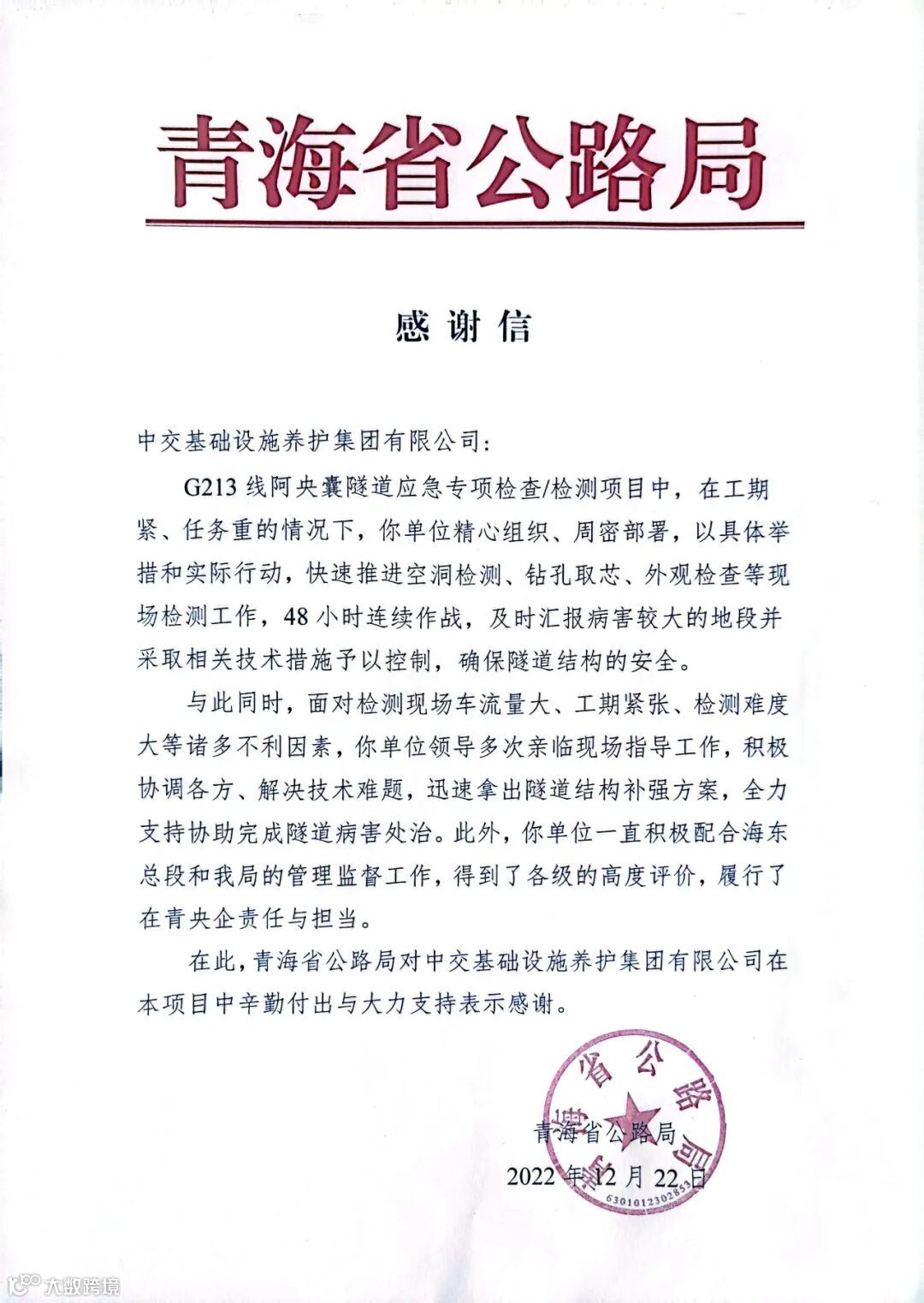 12月22日,公司收到青海省公路局发来表扬信,表彰公司在青海省G213线阿央囊隧道应急专项检查/检测项目中做出的贡献给予了高度赞扬。