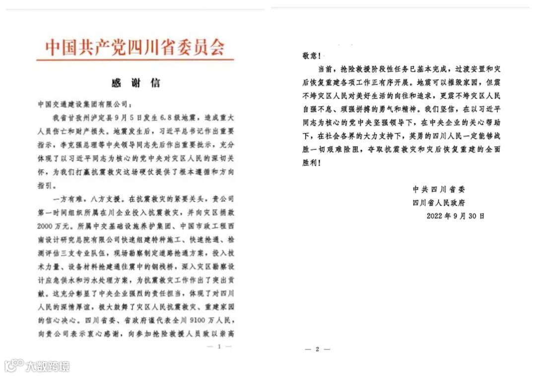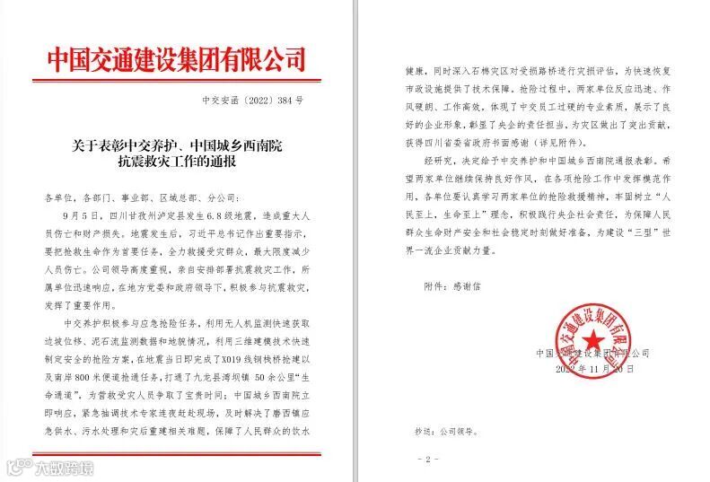 近日,公司获得中共四川省委省政府书面感谢信,并受到中交集团的通报表彰,肯定了公司积极参与四川甘孜州泸定县6.8级地震的抗震救灾应急抢险任务。指出,灾情发生后,公司反应迅速、作风硬朗、工作高效,体现了中交员工过硬的专业素质,展示了良好的企业形象,彰显了央企的责任担当,为灾区做出了突出贡献。