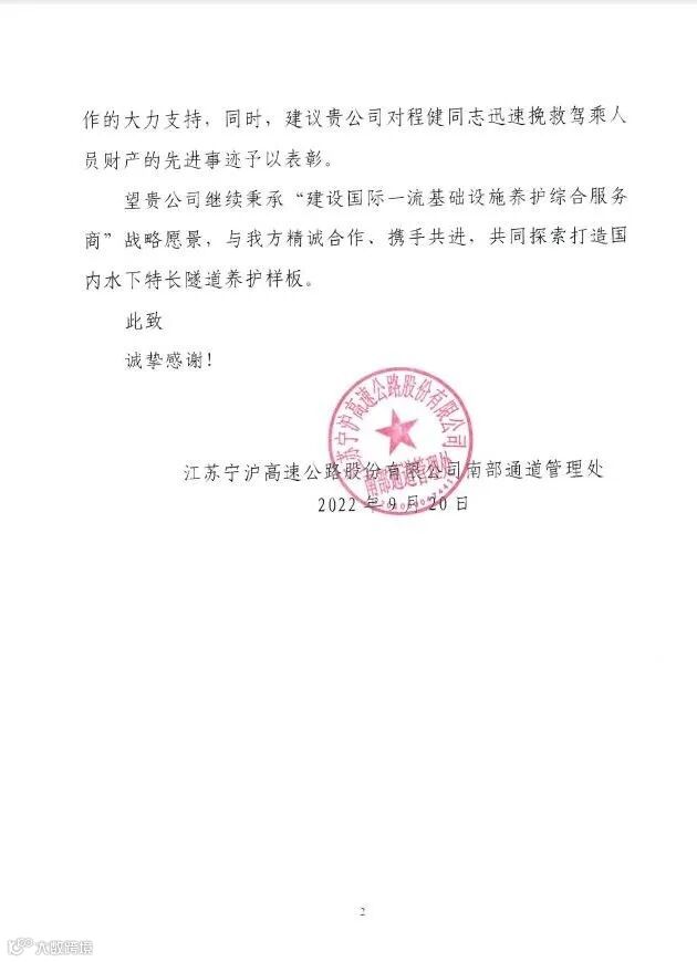 近日,公司收到来自江苏宁沪高速公路股份有限公司南部通道管理处发来的表扬信,信中对公司防撞车驾驶员程健同志在处理一起交通事故中的优异表现进行表扬,对项目部人员展现出的管理水平和专业素质表示赞赏,并特此感谢公司长期以来对南部通道管理处运营管理工作的大力支持。